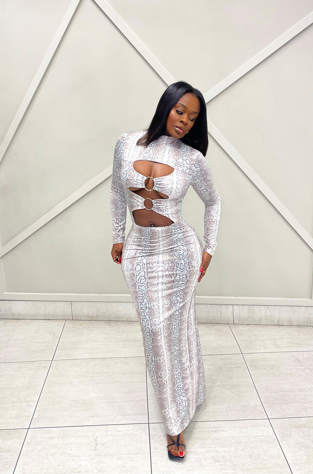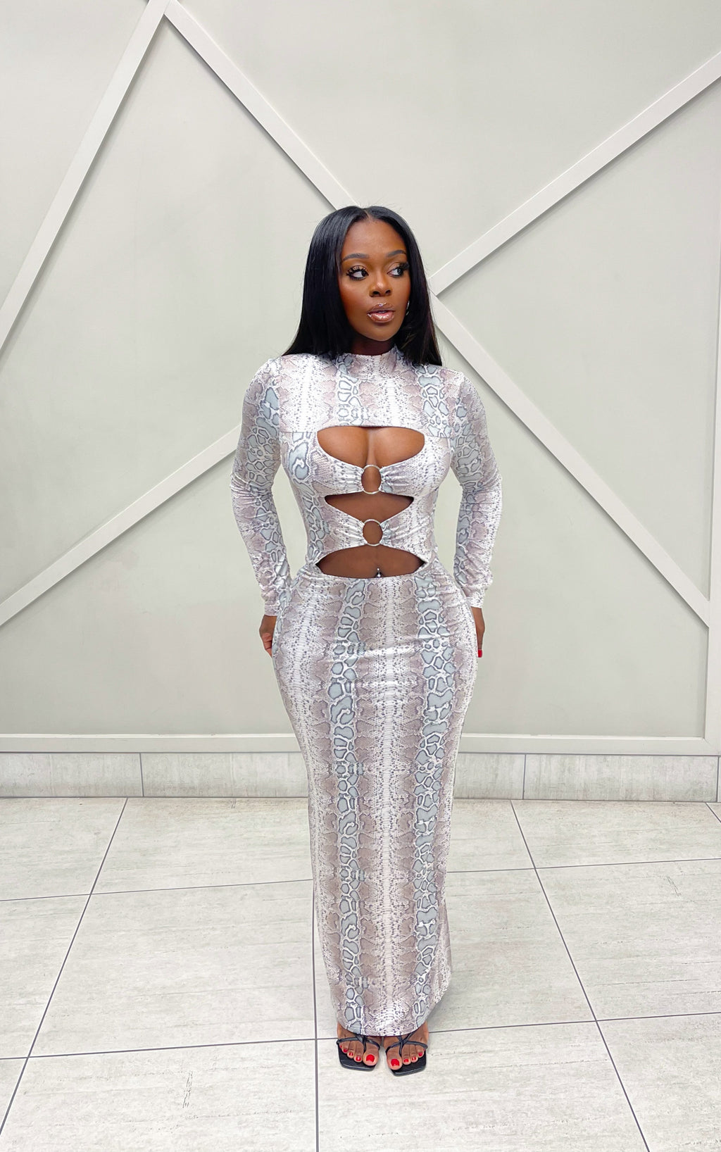 Turn heads the moment you walk in. This maxi dress features a fierce snake print design with strategically placed cut-outs.