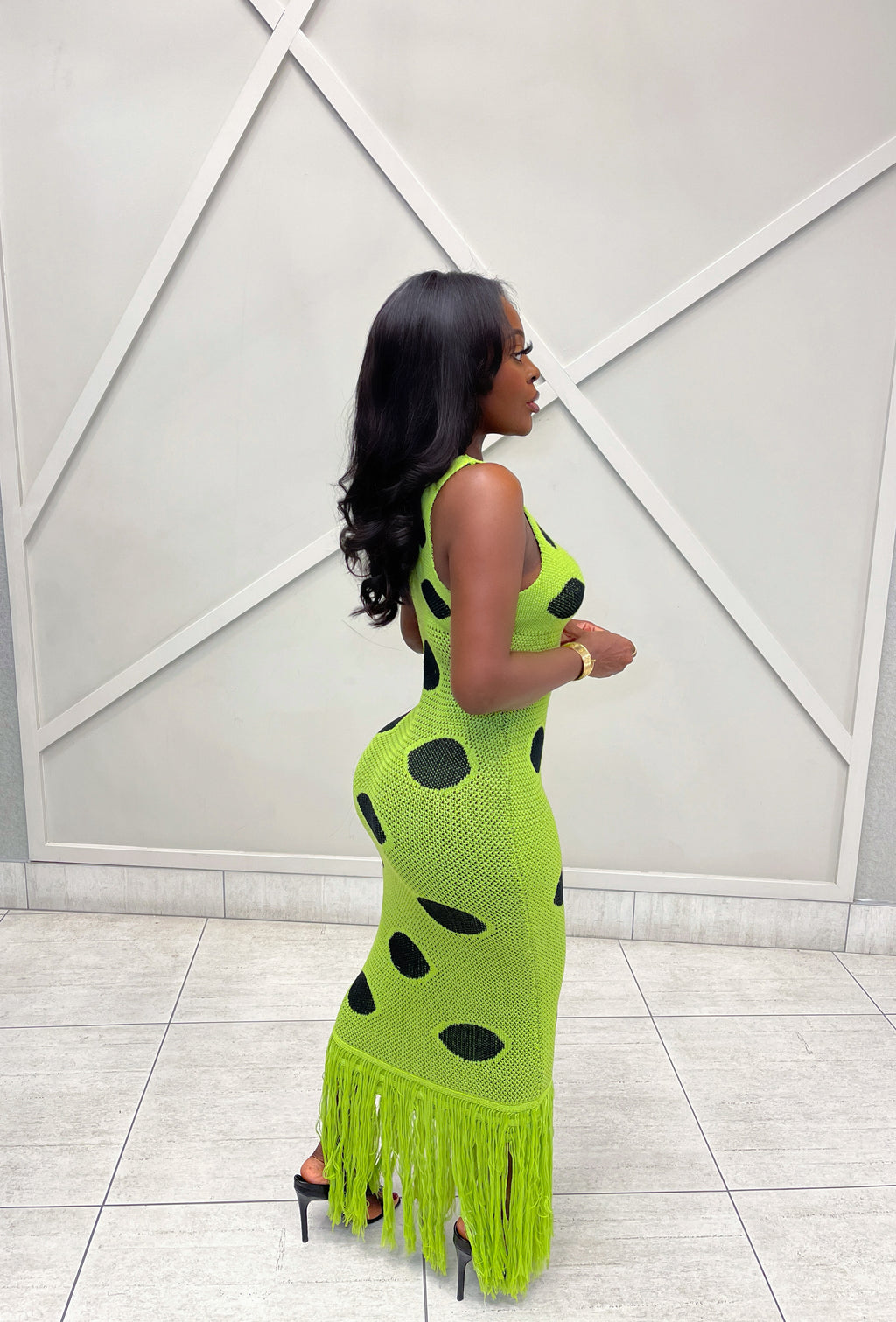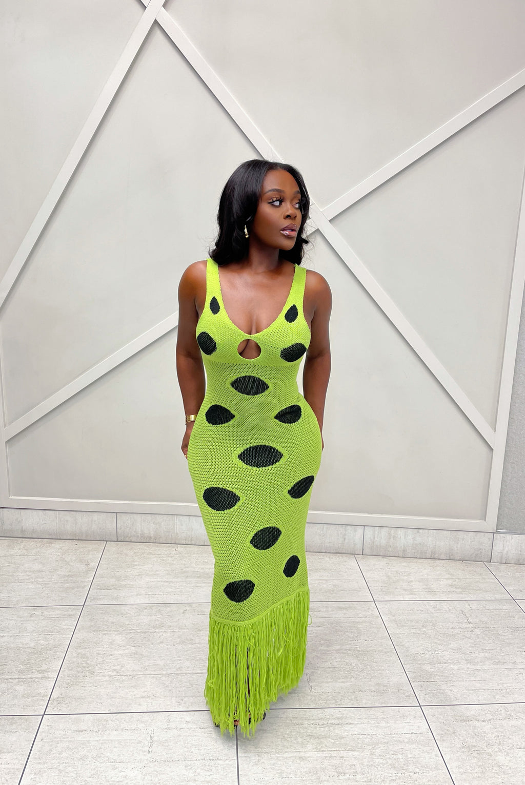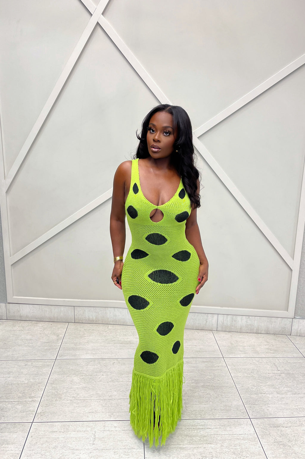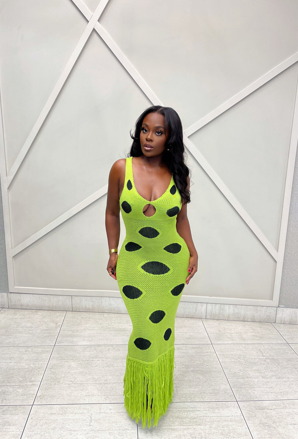 Command attention in our Milan Knit Maxi Dress. A striking lime-green statement piece crafted from a soft, stretch knit fabric.