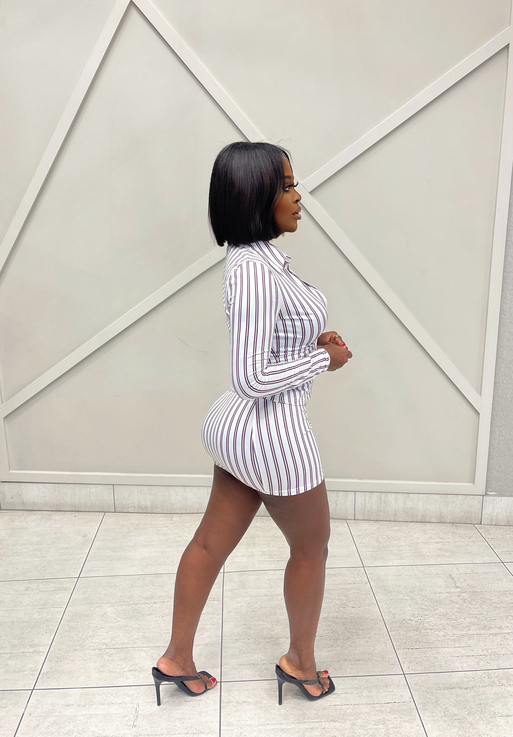 Turn heads in this ultra-flattering two-piece striped skirt set designed to hug your curves in all the right places.